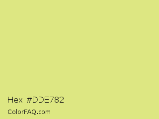 Hex #dde782 Color is a light yellow color and the nearest color is Key Lime #e8f48c. Hex code #dde782 and RGB value is rgb(221,231,130). In RGB color space, this color is composed of 87% red, 91% green, 51% blue, In CMYK color space, this color is composed of 4% cyan, 0% magenta, 44% yellow , 9% black , In HSL color space, this color has a hue angle of 66° , 68% saturation and 71% lightness.