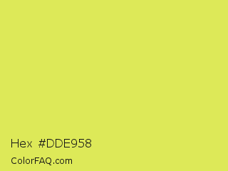 Hex #dde958 Color is a light yellow color and the nearest color is Maximum Green Yellow #d9e650. Hex code #dde958 and RGB value is rgb(221,233,88). In RGB color space, this color is composed of 87% red, 91% green, 35% blue, In CMYK color space, this color is composed of 5% cyan, 0% magenta, 62% yellow , 9% black , In HSL color space, this color has a hue angle of 65° , 77% saturation and 63% lightness.