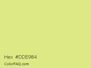 Hex #dde984 Color is a light yellow color and the nearest color is Key Lime #e8f48c. Hex code #dde984 and RGB value is rgb(221,233,132). In RGB color space, this color is composed of 87% red, 91% green, 52% blue, In CMYK color space, this color is composed of 5% cyan, 0% magenta, 43% yellow , 9% black , In HSL color space, this color has a hue angle of 67° , 70% saturation and 72% lightness.
