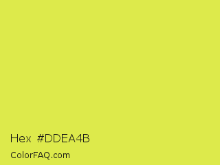 Hex #ddea4b Color is a light yellow color and the nearest color is Maximum Green Yellow #d9e650. Hex code #ddea4b and RGB value is rgb(221,234,75). In RGB color space, this color is composed of 87% red, 92% green, 29% blue, In CMYK color space, this color is composed of 6% cyan, 0% magenta, 68% yellow , 8% black , In HSL color space, this color has a hue angle of 65° , 79% saturation and 61% lightness.