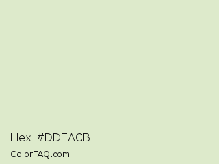 Hex #ddeacb Color is a very light green color and the nearest color is Kidnapper #e1ead4. Hex code #ddeacb and RGB value is rgb(221,234,203). In RGB color space, this color is composed of 87% red, 92% green, 80% blue, In CMYK color space, this color is composed of 6% cyan, 0% magenta, 13% yellow , 8% black , In HSL color space, this color has a hue angle of 85° , 42% saturation and 86% lightness.