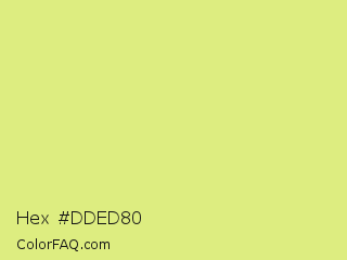 Hex #dded80 Color is a light yellow color and the nearest color is Mindaro #e3f988. Hex code #dded80 and RGB value is rgb(221,237,128). In RGB color space, this color is composed of 87% red, 93% green, 50% blue, In CMYK color space, this color is composed of 7% cyan, 0% magenta, 46% yellow , 7% black , In HSL color space, this color has a hue angle of 69° , 75% saturation and 72% lightness.