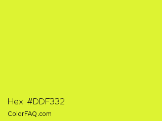 Hex #ddf332 Color is a normal yellow color and the nearest color is Pear #d1e231. Hex code #ddf332 and RGB value is rgb(221,243,50). In RGB color space, this color is composed of 87% red, 95% green, 20% blue, In CMYK color space, this color is composed of 9% cyan, 0% magenta, 79% yellow , 5% black , In HSL color space, this color has a hue angle of 67° , 89% saturation and 57% lightness.