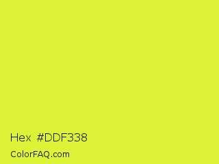 Hex #ddf338 Color is a normal yellow color and the nearest color is Starship #ecf245. Hex code #ddf338 and RGB value is rgb(221,243,56). In RGB color space, this color is composed of 87% red, 95% green, 22% blue, In CMYK color space, this color is composed of 9% cyan, 0% magenta, 77% yellow , 5% black , In HSL color space, this color has a hue angle of 67° , 89% saturation and 59% lightness.