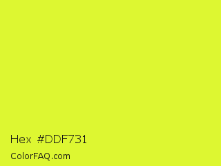 Hex #ddf731 Color is a normal yellow color and the nearest color is Pear #d1e231. Hex code #ddf731 and RGB value is rgb(221,247,49). In RGB color space, this color is composed of 87% red, 97% green, 19% blue, In CMYK color space, this color is composed of 11% cyan, 0% magenta, 80% yellow , 3% black , In HSL color space, this color has a hue angle of 68° , 93% saturation and 58% lightness.