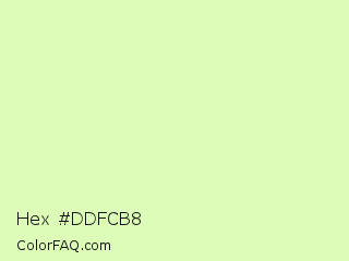 Hex #ddfcb8 Color is a very light green color and the nearest color is Gossip #d2f8b0. Hex code #ddfcb8 and RGB value is rgb(221,252,184). In RGB color space, this color is composed of 87% red, 99% green, 72% blue, In CMYK color space, this color is composed of 12% cyan, 0% magenta, 27% yellow , 1% black , In HSL color space, this color has a hue angle of 87° , 92% saturation and 85% lightness.