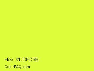 Hex #ddfd3b Color is a light yellow color and the nearest color is Starship #ecf245. Hex code #ddfd3b and RGB value is rgb(221,253,59). In RGB color space, this color is composed of 87% red, 99% green, 23% blue, In CMYK color space, this color is composed of 13% cyan, 0% magenta, 77% yellow , 1% black , In HSL color space, this color has a hue angle of 70° , 98% saturation and 61% lightness.