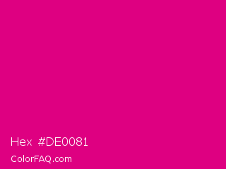 Hex #de0081 Color is a normal magenta color and the nearest color is Mexican Pink #e4007c. Hex code #de0081 and RGB value is rgb(222,0,129). In RGB color space, this color is composed of 87% red, 0% green, 51% blue, In CMYK color space, this color is composed of 0% cyan, 100% magenta, 42% yellow , 13% black , In HSL color space, this color has a hue angle of 325° , 100% saturation and 44% lightness.