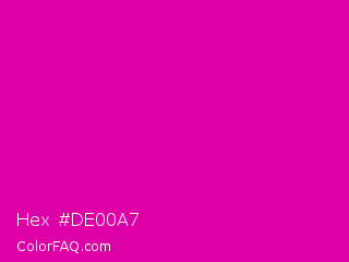 Hex #de00a7 Color is a normal magenta color and the nearest color is Hollywood Cerise #f400a1. Hex code #de00a7 and RGB value is rgb(222,0,167). In RGB color space, this color is composed of 87% red, 0% green, 65% blue, In CMYK color space, this color is composed of 0% cyan, 100% magenta, 25% yellow , 13% black , In HSL color space, this color has a hue angle of 315° , 100% saturation and 44% lightness.