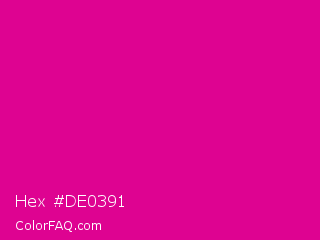 Hex #de0391 Color is a normal magenta color and the nearest color is Mexican Pink #e4007c. Hex code #de0391 and RGB value is rgb(222,3,145). In RGB color space, this color is composed of 87% red, 1% green, 57% blue, In CMYK color space, this color is composed of 0% cyan, 99% magenta, 35% yellow , 13% black , In HSL color space, this color has a hue angle of 321° , 97% saturation and 44% lightness.