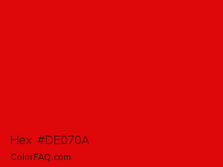 Hex #de070a Color is a normal red color and the nearest color is KU Crimson #e8000d. Hex code #de070a and RGB value is rgb(222,7,10). In RGB color space, this color is composed of 87% red, 3% green, 4% blue, In CMYK color space, this color is composed of 0% cyan, 97% magenta, 95% yellow , 13% black , In HSL color space, this color has a hue angle of 359° , 94% saturation and 45% lightness.