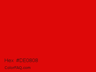 Hex #de0808 Color is a normal red color and the nearest color is KU Crimson #e8000d. Hex code #de0808 and RGB value is rgb(222,8,8). In RGB color space, this color is composed of 87% red, 3% green, 3% blue, In CMYK color space, this color is composed of 0% cyan, 96% magenta, 96% yellow , 13% black , In HSL color space, this color has a hue angle of 0° , 93% saturation and 45% lightness.