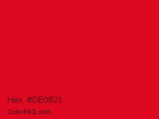 Hex #de0821 Color is a normal red color and the nearest color is Cadmium Red #e30022. Hex code #de0821 and RGB value is rgb(222,8,33). In RGB color space, this color is composed of 87% red, 3% green, 13% blue, In CMYK color space, this color is composed of 0% cyan, 96% magenta, 85% yellow , 13% black , In HSL color space, this color has a hue angle of 353° , 93% saturation and 45% lightness.