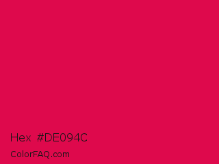Hex #de094c Color is a normal rose color and the nearest color is Debian Red #d70a53. Hex code #de094c and RGB value is rgb(222,9,76). In RGB color space, this color is composed of 87% red, 4% green, 30% blue, In CMYK color space, this color is composed of 0% cyan, 96% magenta, 66% yellow , 13% black , In HSL color space, this color has a hue angle of 341° , 92% saturation and 45% lightness.