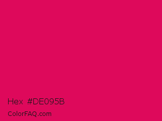 Hex #de095b Color is a normal rose color and the nearest color is Razzmatazz Crayola #e30b5c. Hex code #de095b and RGB value is rgb(222,9,91). In RGB color space, this color is composed of 87% red, 4% green, 36% blue, In CMYK color space, this color is composed of 0% cyan, 96% magenta, 59% yellow , 13% black , In HSL color space, this color has a hue angle of 337° , 92% saturation and 45% lightness.