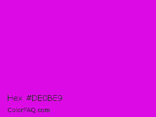 Hex #de0be9 Color is a normal magenta color and the nearest color is Phlox #df00ff. Hex code #de0be9 and RGB value is rgb(222,11,233). In RGB color space, this color is composed of 87% red, 4% green, 91% blue, In CMYK color space, this color is composed of 5% cyan, 95% magenta, 0% yellow , 9% black , In HSL color space, this color has a hue angle of 297° , 91% saturation and 48% lightness.