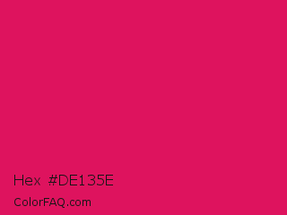 Hex #de135e Color is a normal rose color and the nearest color is Ruby #e0115f. Hex code #de135e and RGB value is rgb(222,19,94). In RGB color space, this color is composed of 87% red, 7% green, 37% blue, In CMYK color space, this color is composed of 0% cyan, 91% magenta, 58% yellow , 13% black , In HSL color space, this color has a hue angle of 338° , 84% saturation and 47% lightness.