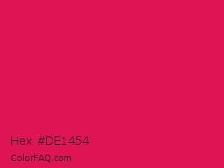Hex #de1454 Color is a normal rose color and the nearest color is Ruby #e0115f. Hex code #de1454 and RGB value is rgb(222,20,84). In RGB color space, this color is composed of 87% red, 8% green, 33% blue, In CMYK color space, this color is composed of 0% cyan, 91% magenta, 62% yellow , 13% black , In HSL color space, this color has a hue angle of 341° , 83% saturation and 47% lightness.