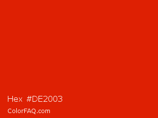 Hex #de2003 Color is a normal red color and the nearest color is Lust #e62020. Hex code #de2003 and RGB value is rgb(222,32,3). In RGB color space, this color is composed of 87% red, 13% green, 1% blue, In CMYK color space, this color is composed of 0% cyan, 86% magenta, 99% yellow , 13% black , In HSL color space, this color has a hue angle of 8° , 97% saturation and 44% lightness.