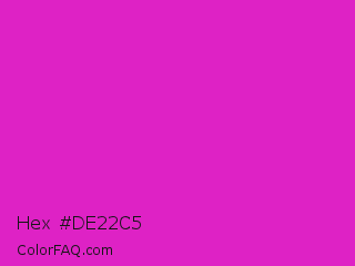 Hex #de22c5 Color is a normal magenta color and the nearest color is Steel Pink #cc33cc. Hex code #de22c5 and RGB value is rgb(222,34,197). In RGB color space, this color is composed of 87% red, 13% green, 77% blue, In CMYK color space, this color is composed of 0% cyan, 85% magenta, 11% yellow , 13% black , In HSL color space, this color has a hue angle of 308° , 74% saturation and 50% lightness.