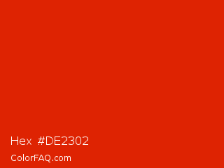 Hex #de2302 Color is a normal red color and the nearest color is Lust #e62020. Hex code #de2302 and RGB value is rgb(222,35,2). In RGB color space, this color is composed of 87% red, 14% green, 1% blue, In CMYK color space, this color is composed of 0% cyan, 84% magenta, 99% yellow , 13% black , In HSL color space, this color has a hue angle of 9° , 98% saturation and 44% lightness.