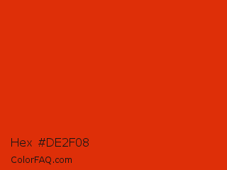 Hex #de2f08 Color is a normal red color and the nearest color is Vermilion #d9381e. Hex code #de2f08 and RGB value is rgb(222,47,8). In RGB color space, this color is composed of 87% red, 18% green, 3% blue, In CMYK color space, this color is composed of 0% cyan, 79% magenta, 96% yellow , 13% black , In HSL color space, this color has a hue angle of 11° , 93% saturation and 45% lightness.