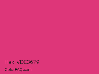 Hex #de3679 Color is a normal rose color and the nearest color is Cerise #da3287. Hex code #de3679 and RGB value is rgb(222,54,121). In RGB color space, this color is composed of 87% red, 21% green, 47% blue, In CMYK color space, this color is composed of 0% cyan, 76% magenta, 45% yellow , 13% black , In HSL color space, this color has a hue angle of 336° , 72% saturation and 54% lightness.