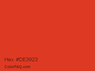 Hex #de3923 Color is a normal red color and the nearest color is Vermilion #d9381e. Hex code #de3923 and RGB value is rgb(222,57,35). In RGB color space, this color is composed of 87% red, 22% green, 14% blue, In CMYK color space, this color is composed of 0% cyan, 74% magenta, 84% yellow , 13% black , In HSL color space, this color has a hue angle of 7° , 74% saturation and 50% lightness.
