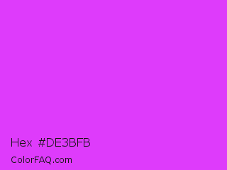 Hex #de3bfb Color is a light purple color and the nearest color is Purple Pizzazz #fe4eda. Hex code #de3bfb and RGB value is rgb(222,59,251). In RGB color space, this color is composed of 87% red, 23% green, 98% blue, In CMYK color space, this color is composed of 12% cyan, 76% magenta, 0% yellow , 2% black , In HSL color space, this color has a hue angle of 291° , 96% saturation and 61% lightness.