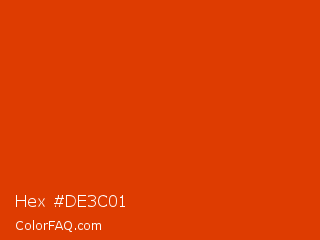 Hex #de3c01 Color is a normal orange color and the nearest color is Grenadier #d54600. Hex code #de3c01 and RGB value is rgb(222,60,1). In RGB color space, this color is composed of 87% red, 24% green, 0% blue, In CMYK color space, this color is composed of 0% cyan, 73% magenta, 100% yellow , 13% black , In HSL color space, this color has a hue angle of 16° , 99% saturation and 44% lightness.