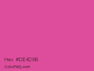 Hex #de4d9b Color is a normal rose color and the nearest color is Raspberry Pink #e25098. Hex code #de4d9b and RGB value is rgb(222,77,155). In RGB color space, this color is composed of 87% red, 30% green, 61% blue, In CMYK color space, this color is composed of 0% cyan, 65% magenta, 30% yellow , 13% black , In HSL color space, this color has a hue angle of 328° , 69% saturation and 59% lightness.