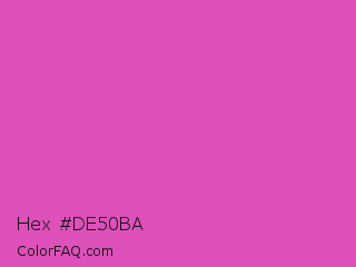Hex #de50ba Color is a normal magenta color and the nearest color is Fuchsia Pink #c154c1. Hex code #de50ba and RGB value is rgb(222,80,186). In RGB color space, this color is composed of 87% red, 31% green, 73% blue, In CMYK color space, this color is composed of 0% cyan, 64% magenta, 16% yellow , 13% black , In HSL color space, this color has a hue angle of 315° , 68% saturation and 59% lightness.