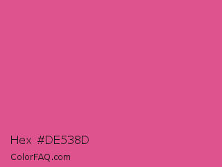 Hex #de538d Color is a normal rose color and the nearest color is Fandango Pink #de5285. Hex code #de538d and RGB value is rgb(222,83,141). In RGB color space, this color is composed of 87% red, 33% green, 55% blue, In CMYK color space, this color is composed of 0% cyan, 63% magenta, 36% yellow , 13% black , In HSL color space, this color has a hue angle of 335° , 68% saturation and 60% lightness.