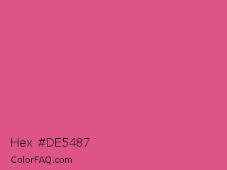 Hex #de5487 Color is a normal rose color and the nearest color is Fandango Pink #de5285. Hex code #de5487 and RGB value is rgb(222,84,135). In RGB color space, this color is composed of 87% red, 33% green, 53% blue, In CMYK color space, this color is composed of 0% cyan, 62% magenta, 39% yellow , 13% black , In HSL color space, this color has a hue angle of 338° , 68% saturation and 60% lightness.