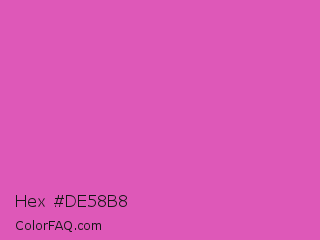 Hex #de58b8 Color is a light magenta color and the nearest color is Super Pink #cf6ba9. Hex code #de58b8 and RGB value is rgb(222,88,184). In RGB color space, this color is composed of 87% red, 35% green, 72% blue, In CMYK color space, this color is composed of 0% cyan, 60% magenta, 17% yellow , 13% black , In HSL color space, this color has a hue angle of 317° , 67% saturation and 61% lightness.