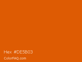 Hex #de5b03 Color is a normal orange color and the nearest color is Bamboo #da6304. Hex code #de5b03 and RGB value is rgb(222,91,3). In RGB color space, this color is composed of 87% red, 36% green, 1% blue, In CMYK color space, this color is composed of 0% cyan, 59% magenta, 99% yellow , 13% black , In HSL color space, this color has a hue angle of 24° , 97% saturation and 44% lightness.