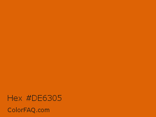Hex #de6305 Color is a normal orange color and the nearest color is Bamboo #da6304. Hex code #de6305 and RGB value is rgb(222,99,5). In RGB color space, this color is composed of 87% red, 39% green, 2% blue, In CMYK color space, this color is composed of 0% cyan, 55% magenta, 98% yellow , 13% black , In HSL color space, this color has a hue angle of 26° , 96% saturation and 45% lightness.