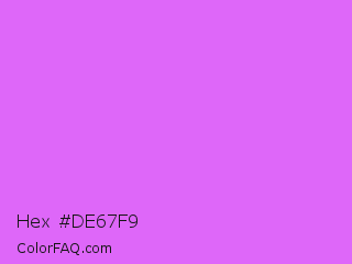 Hex #de67f9 Color is a light purple color and the nearest color is Heliotrope #df73ff. Hex code #de67f9 and RGB value is rgb(222,103,249). In RGB color space, this color is composed of 87% red, 40% green, 98% blue, In CMYK color space, this color is composed of 11% cyan, 59% magenta, 0% yellow , 2% black , In HSL color space, this color has a hue angle of 289° , 92% saturation and 69% lightness.