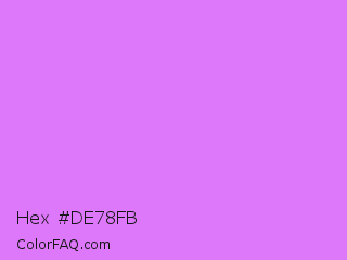 Hex #de78fb Color is a light purple color and the nearest color is Heliotrope #df73ff. Hex code #de78fb and RGB value is rgb(222,120,251). In RGB color space, this color is composed of 87% red, 47% green, 98% blue, In CMYK color space, this color is composed of 12% cyan, 52% magenta, 0% yellow , 2% black , In HSL color space, this color has a hue angle of 287° , 94% saturation and 73% lightness.
