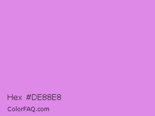 Hex #de88e8 Color is a light magenta color and the nearest color is Bright Lilac #d891ef. Hex code #de88e8 and RGB value is rgb(222,136,232). In RGB color space, this color is composed of 87% red, 53% green, 91% blue, In CMYK color space, this color is composed of 4% cyan, 41% magenta, 0% yellow , 9% black , In HSL color space, this color has a hue angle of 294° , 68% saturation and 72% lightness.