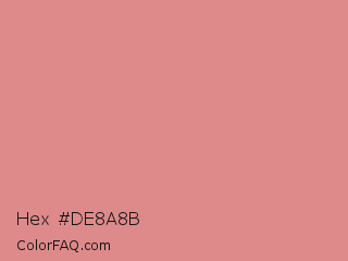 Hex #de8a8b Color is a light red color and the nearest color is My Pink #d69188. Hex code #de8a8b and RGB value is rgb(222,138,139). In RGB color space, this color is composed of 87% red, 54% green, 55% blue, In CMYK color space, this color is composed of 0% cyan, 38% magenta, 37% yellow , 13% black , In HSL color space, this color has a hue angle of 359° , 56% saturation and 71% lightness.