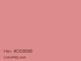 Hex #de8b8b Color is a light red color and the nearest color is My Pink #d69188. Hex code #de8b8b and RGB value is rgb(222,139,139). In RGB color space, this color is composed of 87% red, 55% green, 55% blue, In CMYK color space, this color is composed of 0% cyan, 37% magenta, 37% yellow , 13% black , In HSL color space, this color has a hue angle of 0° , 56% saturation and 71% lightness.