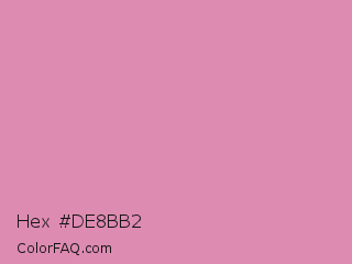 Hex #de8bb2 Color is a light rose color and the nearest color is Middle Purple #d982b5. Hex code #de8bb2 and RGB value is rgb(222,139,178). In RGB color space, this color is composed of 87% red, 55% green, 70% blue, In CMYK color space, this color is composed of 0% cyan, 37% magenta, 20% yellow , 13% black , In HSL color space, this color has a hue angle of 332° , 56% saturation and 71% lightness.