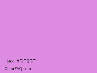 Hex #de8be4 Color is a light magenta color and the nearest color is Bright Lilac #d891ef. Hex code #de8be4 and RGB value is rgb(222,139,228). In RGB color space, this color is composed of 87% red, 55% green, 89% blue, In CMYK color space, this color is composed of 3% cyan, 39% magenta, 0% yellow , 11% black , In HSL color space, this color has a hue angle of 296° , 62% saturation and 72% lightness.