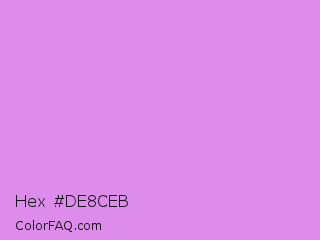 Hex #de8ceb Color is a light magenta color and the nearest color is Bright Lilac #d891ef. Hex code #de8ceb and RGB value is rgb(222,140,235). In RGB color space, this color is composed of 87% red, 55% green, 92% blue, In CMYK color space, this color is composed of 6% cyan, 40% magenta, 0% yellow , 8% black , In HSL color space, this color has a hue angle of 292° , 70% saturation and 74% lightness.
