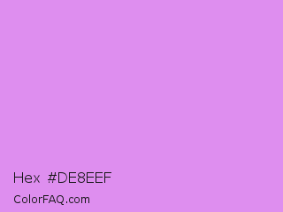 Hex #de8eef Color is a light purple color and the nearest color is Bright Lilac #d891ef. Hex code #de8eef and RGB value is rgb(222,142,239). In RGB color space, this color is composed of 87% red, 56% green, 94% blue, In CMYK color space, this color is composed of 7% cyan, 41% magenta, 0% yellow , 6% black , In HSL color space, this color has a hue angle of 289° , 75% saturation and 75% lightness.