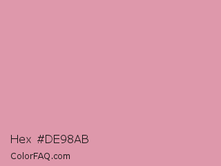 Hex #de98ab Color is a light rose color and the nearest color is Light Thulian Pink #e68fac. Hex code #de98ab and RGB value is rgb(222,152,171). In RGB color space, this color is composed of 87% red, 60% green, 67% blue, In CMYK color space, this color is composed of 0% cyan, 32% magenta, 23% yellow , 13% black , In HSL color space, this color has a hue angle of 344° , 51% saturation and 73% lightness.