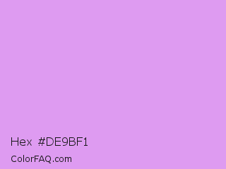 Hex #de9bf1 Color is a light purple color and the nearest color is Bright Lilac #d891ef. Hex code #de9bf1 and RGB value is rgb(222,155,241). In RGB color space, this color is composed of 87% red, 61% green, 95% blue, In CMYK color space, this color is composed of 8% cyan, 36% magenta, 0% yellow , 5% black , In HSL color space, this color has a hue angle of 287° , 75% saturation and 78% lightness.