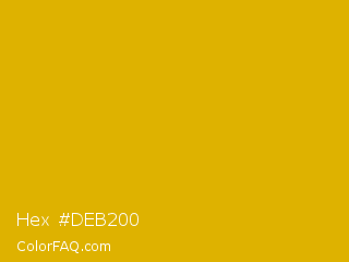 Hex #deb200 Color is a normal yellow color and the nearest color is Galliano #dcb20c. Hex code #deb200 and RGB value is rgb(222,178,0). In RGB color space, this color is composed of 87% red, 70% green, 0% blue, In CMYK color space, this color is composed of 0% cyan, 20% magenta, 100% yellow , 13% black , In HSL color space, this color has a hue angle of 48° , 100% saturation and 44% lightness.