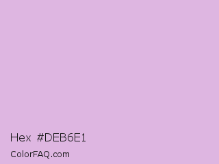 Hex #deb6e1 Color is a light magenta color and the nearest color is Thistle #d8bfd8. Hex code #deb6e1 and RGB value is rgb(222,182,225). In RGB color space, this color is composed of 87% red, 71% green, 88% blue, In CMYK color space, this color is composed of 1% cyan, 19% magenta, 0% yellow , 12% black , In HSL color space, this color has a hue angle of 296° , 42% saturation and 80% lightness.